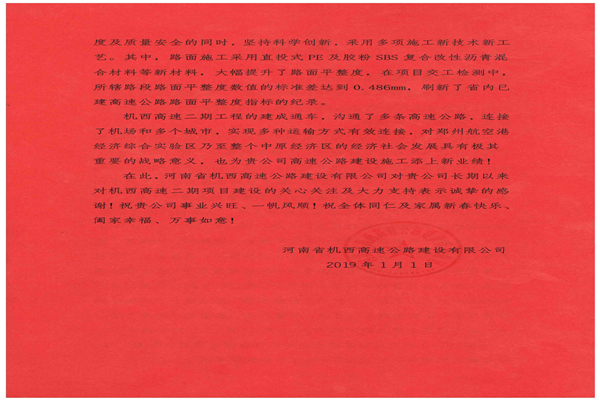 信中還贊譽(yù)以項(xiàng)目經(jīng)理為首的領(lǐng)導(dǎo)班子在保證施工進(jìn)度及質(zhì)量安全的同時(shí),堅(jiān)持科學(xué)創(chuàng)新,采用多項(xiàng)施工新技術(shù)新工藝。路面施工采用直投式PE及膠粉SBS復(fù)合改性瀝青混合材料等新材料,大幅提升了路面平整度,交工檢測(cè)時(shí)標(biāo)準(zhǔn)差僅為0.486mm,刷新了河南省內(nèi)已建高速公路路面平整度指標(biāo)的記錄。