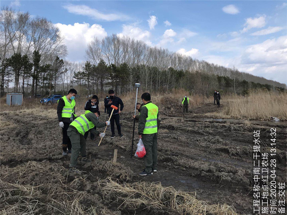 4月28日,黑龍江農(nóng)墾建三江管理局青龍山灌區(qū)管理站總工程師宋協(xié)勝、黑龍江農(nóng)墾勘測(cè)設(shè)計(jì)研究院劉萬金、黑龍江省北方水利水電工程監(jiān)理有限公司總監(jiān)劉洋同項(xiàng)目部進(jìn)行非正式交接樁,確定中南二干提水站、獨(dú)立二支渠灌溉站的軸線及施工占地紅線位置,提前籌劃施工。