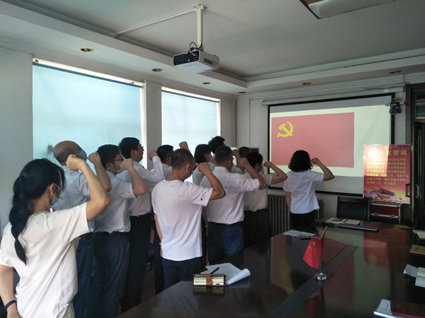 全體黨員面向黨旗,在黨支部書記周巍的領(lǐng)誓下,舉起右拳,高聲宣讀入黨誓詞,一起回顧了入黨時的初心和追求,牢牢記住曾經(jīng)誓言,不忘初心,砥礪前行。