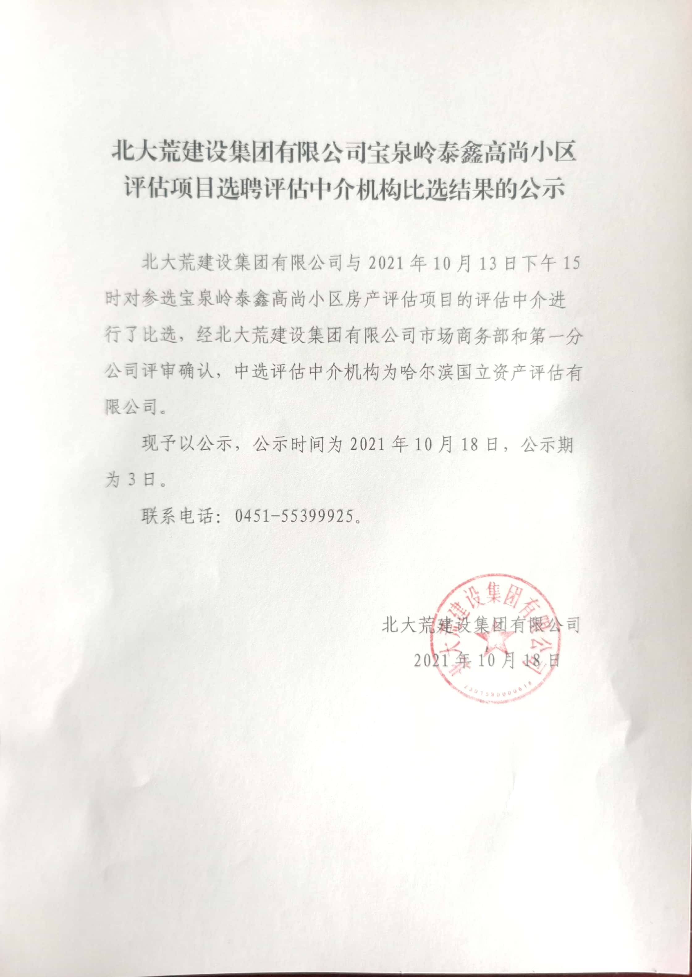 北大荒建設(shè)集團有限公司寶泉嶺泰鑫高尚小區(qū)評估項目選聘評估中介機構(gòu)比選結(jié)果的公示